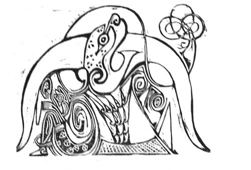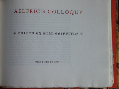Aelfric's Colloquy by Bill Griffiths Size: 10 x 8 ins. Date: 1980 Description: [40pp.] Set in 16pt. Polipholus and Blado type. Printed on Hayle Mill hand-made paper. Quarter bound in puple leather with cork over boards. Orange end-papers. Illustrations: 5 wood-engravings by Nicholas Parry No. of Copies: 90 numbered copies Comments: Printed on a Wharfdale Bremner handpress. Signed by Nicholas Parry and Bill Griffiths. Price: £24 |