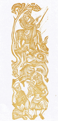 Sir Orfeo Size: 7.25 x 14.75 ins. Date: June 1980 Description: [32pp.] Set in 18pt Delphin type. Printed on Glastonbury paper. Bound in wood grain designed cloth over boards with a brown leather spine with gilt lettering. Dark brown end-papers. Illustrations: 8 coloured wood-cuts by Nicholas Parry No. of Copies: 95 numbered copies including 21 specials. Comments: Title-page states June, colophon states July. A copy has been viewed with marbled end-papers, dark brown leather spine, printed on paper 8.75 ins. wide. Signed by Nicholas Parry. Colophon states July. Price: £45 |