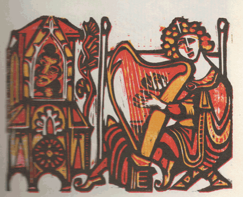 Prince Bluebeard's Castle: a libretto adapted from the Hungarian of Bela Balaz, and The Splendid Stag: a Bartok companion by Thomas Orszag-land Size:6 x 10 ins. Date: 1978 Description: 52pp. Set in 16pt Poliphilus and Blado type. Printed on Chilham paper. Quarter bound in leather with Liberty patterned fabric over boards. Marbled end-papers. Illustrations: 8 two-coloured woodcut & etched lino lost block illustrations by Nicholas Parry No. of Copies: 90 numbered copies Comments: Signed by the author and Nicholas and Mary Parry. A copy has been seen bound in blue leather with a blind stamped design on the front cover. Another copy has been seen bound in full Liberty patterned fabric with plain brown endpapers. A lithographic reproduction in card covers was printed by Poynton House Press, Market Drayton, priced £2. 10p. Price: £25 |