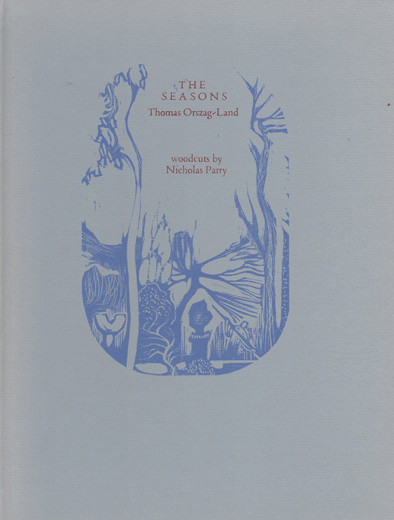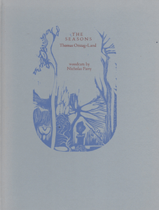 The Seasons by Thomas Orszag-land Size: 7.5 x 10 ins. Date: 1980 Description: [40pp.] Set in 16pt. Poliphus and Blado type. Printed on Glastonbury Antique paper. Bound in grey cloth covered boards with a printed design in blue and red lettering to the front cover and red lettering to the spine. Illustrations: 12 coloured woodcuts by Nicholas Parry. No. of Copies: 90 numbered copies. Comments: Signed by Nicholas Parry and Thomas Orszag-land. Price: £18 |