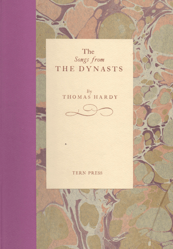 The Songs from Dynasts by Thomas Hardy Size:7.5 x 11 ins. Date: October 1980 Description: [16pp.] Set in 14pt Caslon type. Printed on Zercall cream mould-made paper. Sewn. Quarter bound in dark pink paper lettered in black to the spine with marbled paper over boards, with printed label to the front cover. Pale brown end-papers. Illustrations: 4 wood-engravings by Nicholas Parry. No. of Copies: 230 numbered copies. Comments: Signed by Nicholas and Mary Parry. Edition in wrappers. Case bound £15 Price: £7.50 |
