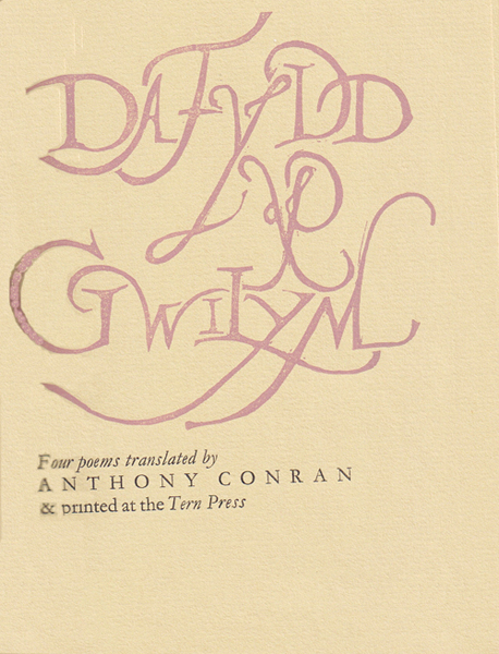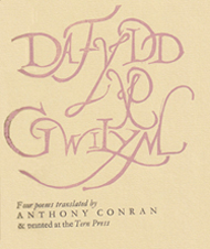 Dafydd ap Gwilym translated by Anthony Conran Size: 4.5 x 6.5 ins. Date: [1984] Description:[46pp.] Set in 12pt. Garamond type. Printed on fawn Zercall Ingress paper. Quarter bound Illustrations: 4 wood engravings by Nicholas Parry No. of Copies: 180 numbered copies. Comments: No date of publication printed.Four Poems - The Greyfriar and The Poet, The Seagull, The Wind & The Ruin. Signed by Nicholas Parry and Anthony Conran. Price: £27 |