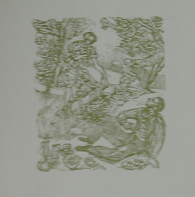 The Burial by George Miller Size: 7.5 x 5 ins Date: 1985 Description:24pp. Set in 12pt Plantin type. Printed on Views of the Rhine paper. Bound in full calf by George Miller. Illustrations:20 linocuts by Nicholas Parry No. of Copies: 10 copies. Comments:signed by Nicholas and Mary Parry Price: |