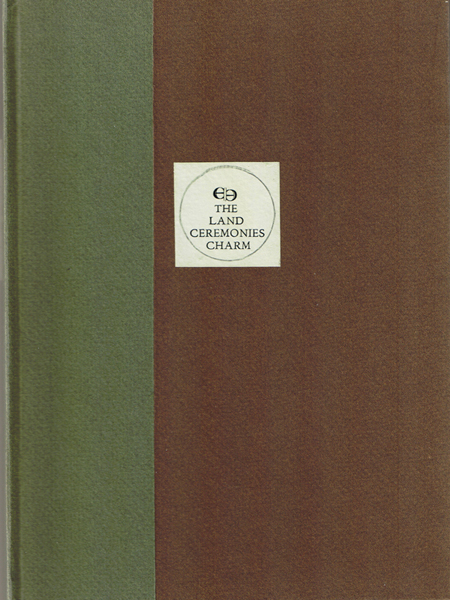 The Land Ceremonies Charm edited and translated by Bill Griffiths Size: 6.5 x 9.3 ins. Date: September 1985 Description: [27pp.] Set in 16pt. Poliphus and Blado type. Printed on Basingwerk paper. Quarter bound in green paper with brown paper covered boards with a printed paper label to the spine and front board. Olive-green end-papers. Illustrations: 5 colour illustrations by Mary Parry No. of Copies: 185 numbered copies. Comments: Signed by Mary Parry and Bill Griffiths. Price: |