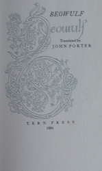 Beowulf translated by John Porter Size: 6.25 x 10 ins. Date: 1984 Description: [116pp.] Set in 12pt Baskerville type. Printed on Chilham paper. Bound in full leather. Illustrations: 12 original drawings by Nicholas Parry. No. of Copies: 10 copies Comments: Numbered, 1 to 10. Signed by Nicholas and Mary Parry Price:POA |