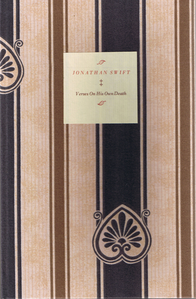 Verses on the Death of Dr. Swift by Jonathan Swift Size: 6.5 x 10.5 ins. Date: August 1992 Description: [46pp.] Set in 18pt. Bodoni type. Printed on Zerkall paper. Bound in printed fabric covered boards with a printed label to the spine and front board. Cream end-papers. Illustrations: 9 three-colour etched linocuts by Nicholas Parry. No. of Copies: 95 numbered copies. Comments: Edited with notes by A. Norman Jeffares. Signed by Nicholas and Mary Parry. Price: £60 |