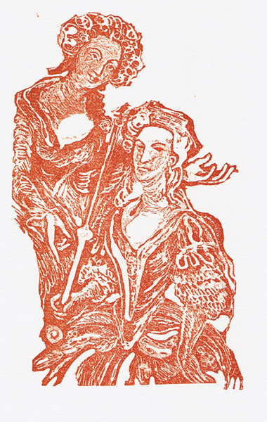 The Epic of Gilgamesh translated by Bill Griffiths Size: 7.5 x 10.5 ins. Date: July 1992 Description: [40pp.] Set in 18pt Bodoni type. Printed on Zerkall paper. Bound in printed fabric covered boards with a red printed label to the spine and front board. Cream end-papers. Illustrations: 9 three-colour woodcuts by Nicholas Parry No. of Copies: 95 numbered copies. Comments: Episode One Gilgamesh and Enkidu. Also issued in stiff blue marbled card covers. Signed by Nicholas and Mary Parry. Price: £30 |
