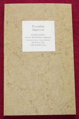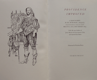 Providence Improved. A manuscript by Ed. Burghah Size: 6.25 x 10.5 ins. Date: August 1993 Description: [67pp.] Set in 12pt Caslon type. Printed on Zerkall paper. Bound in 'elephant' paper covered boards with a printed paper label to the spine and front board. Marbled paper end-papers. Illustrations: 19 original drawings by Nicholas Parry. No. of Copies: 10 numbered copies. Comments: 10 copies, numbered 1 to 10. Signed by Nicholas Parry. Price: £100 |