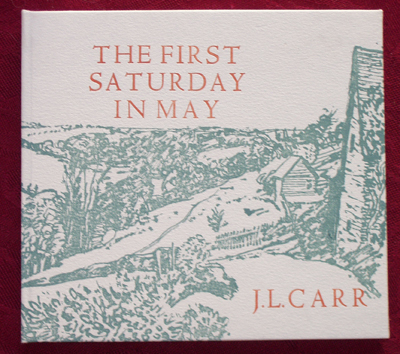 The First Saturday in May by James Lloyd Carr Size:6.25 x 5.5 ins. Date: August 1993 Description: [22pp.] Set in 14pt Nicholas Jenson type. Printed on Lana paper. Bound in white and green pictorial paper covered boards. With pale green/brown end-papers. Illustrations: 8 wood engravings by Nicholas Parry No. of Copies: 140 numbered copies. Comments: Signed by Nicholas and Mary Parry Price: £30 |