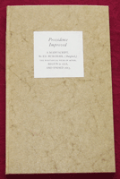 Providence Improved. A manuscript by Ed. Burghah Size: 6.25 x 10.5 ins. Date: August 1993 Description: [67pp.] Set in 12pt Caslon type. Printed on Zerkall paper. Bound in 'elephant' paper covered boards with a printed paper label to the spine and front board. Marbled paper end-papers. Illustrations: 19 etchings by Nicholas Parry printed from line blocks. No. of Copies: 200 numbered copies. Comments: Including 10 special copies. Signed by Nicholas Parry. Price: £60 |