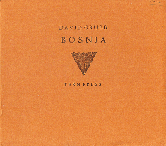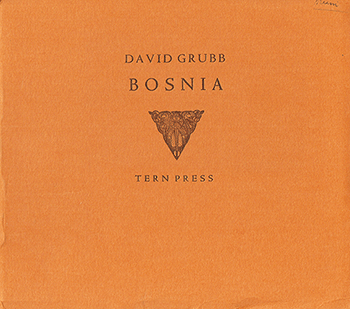 Bosnia by David Grubb Size: 8.5 x 9.5 ins. Date: 1996 Description:[16pp] orange printed wrappers. Illustrations:One signed and numbered woodcut by Nicholas Parry No. of Copies: 200 Comments: Proceeds to Feed the Children Price: |