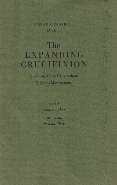 The Expanding Crucifixion by Giovanni Crescimbeni Size: 6 x 9.8 ins. Date: 1996 Description: Printed by hand. Folded sheet of hand-made paper glued into dark green printed covers. Illustrations: 1 wood block engraving by Nicholas Parry No. of Copies: 50 numbered copies. Comments: First issue of the Audley series. Price: |