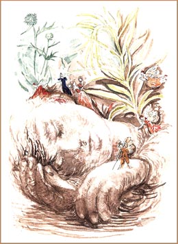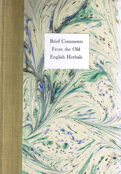 Brief Comments From the Old English Herbals by Bill Griffiths Size: 7.5 x 11 ins. Date: October 2005 Description: [47pp.] Set in 24pt. Issac Moore type. Printed on Whatman paper. Quarter bound in green.grey cloth spine with marbled paper covered boards with printed spine label to the spine and front board. Pale blue end-papers. Illustrations: 19 illustrations hand-painted by Mary Parry. No. of Copies: 25 numbered copies. Comments: Signed by Nicholas and Mary Parry. Price: £150 |