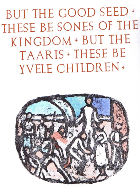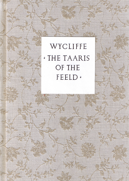 The Taaris of the Feeld by John Wycliffe Size: 7.5 x 11 ins. Date: October 2005 Description: [29pp.] Bound in decorated fabric covered boards with a black printed label to the spine and front board. Russet brown end-papers. Illustrations: 23 hand painted illustrations by Nicholas Parry. No. of Copies: 25 numbered copies. Comments: Signed by Nicholas and Mary Parry. Price: £150 |