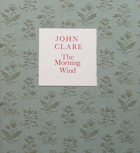 The Morning Wind by John Clare Size: 9 x 10 ins. Date: July 2006 Description: [29pp.] Set in Caslon type. Printed on Whatman paper. Bound in decorated blue linen covered boards with a red printed paper label to the spine and the front board. Illustrations: 7 illustrations by Nicholas Parry No. of Copies: 40 copies. Comments:Introduction by Ronald Blythe. Type set by Kelsey Thornton. Signed by Nicholas and Mary Parry. Price: £90 |